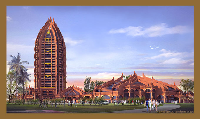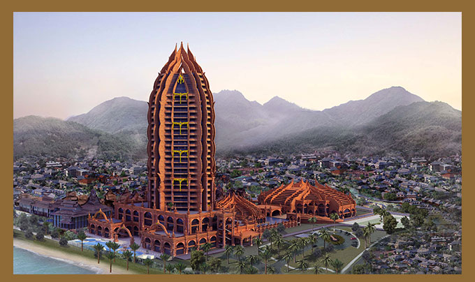 我們將“花型”大堂,設(shè)置在基臺的水池之上,使其猶如在水上盛開的奇花,高雅迷人。大堂內(nèi)部的裝修也充滿了熱帶雨林的氣氛,大象,孔雀,蓮花,貝葉棕等等都裝飾其中。